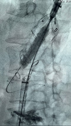 4. 经长鞘导入导管后,超选入腹腔干动脉,送入先健覆膜支架10*80mm一枚,近端重叠内分支,远端重叠腹腔干动脉,并予以10mm球囊后扩,手推造影显影良好。
