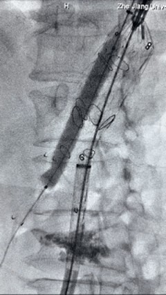 9. 经左股动脉送入导丝导管,超选进腹主动脉支架短腿内,后沿导丝送入髂支,同理,右侧沿导丝送入髂支并释放,使用先健顺应性球囊后扩各支架连接处及支架近远端,最后通过预留导管向瘤腔注入人纤维蛋白粘合剂数支,造影显示分支通畅。