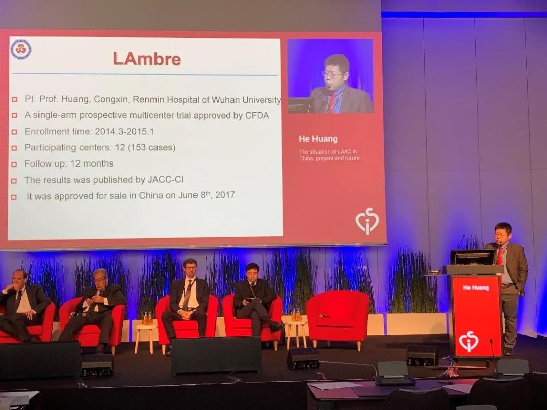 另外,此次盛会上有多位来自中国的结构性心脏病专家进行了精彩的学术报告。首先由来自中国的主席团成员武汉大学人民医院心内科黄鹤教授为大家带来了题为《中国左心耳封堵术的现状与展望》和《左心耳挑战病例分享》的两个主题发言,向全球专家分享了LAmbre™左心耳封堵器系统在中国丰富的植入数据及临床使用经验。