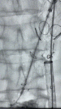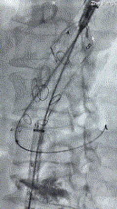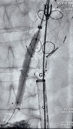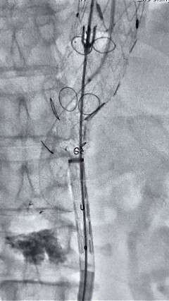 6. 解除束径,打开近端后释放,经肱动脉长鞘超选支架外分支,并进一步超选右侧肾动脉,交换加硬导丝,送入覆膜支架6*50mm和7*60mm各一枚,并予以球囊后扩张,手推造影显影良好。