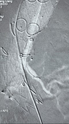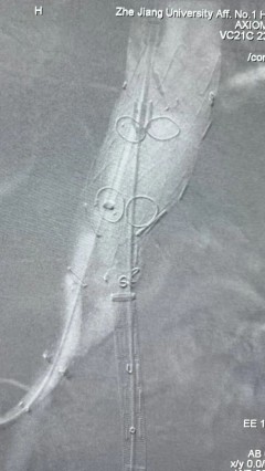 4. 经长鞘导入导管后,超选入腹腔干动脉,送入先健覆膜支架10*80mm一枚,近端重叠内分支,远端重叠腹腔干动脉,并予以10mm球囊后扩,手推造影显影良好。