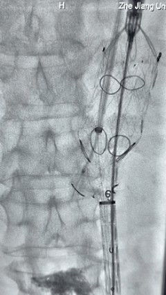 8. 从右侧股动脉入路送入腹主支架AB-24-12-110-S,近端重叠胸腹主动脉支架远端,调整好支架位置后释放。