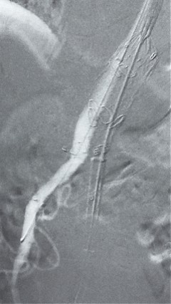 9. 经左股动脉送入导丝导管,超选进腹主动脉支架短腿内,后沿导丝送入髂支,同理,右侧沿导丝送入髂支并释放,使用先健顺应性球囊后扩各支架连接处及支架近远端,最后通过预留导管向瘤腔注入人纤维蛋白粘合剂数支,造影显示分支通畅。