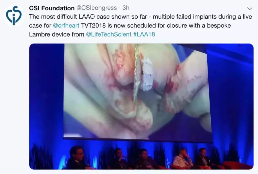 武汉大学人民医院心内科黄鹤教授, Dr. Apostolos Tzikas, Dr. Sameer Gafoor, Dr. Jacob Odenstedt以及Dr. Matthew Daniels几位点评嘉宾现场就手术直播进行了详细互动式的讨论,手术的成功获得了在场专家的高度赞誉。CSI大会也评价该病例为有史以来最难的左心耳封堵手术,不同的厂家产品屡试屡败后,最终由一枚先健特制的LAmbre™成功封堵。