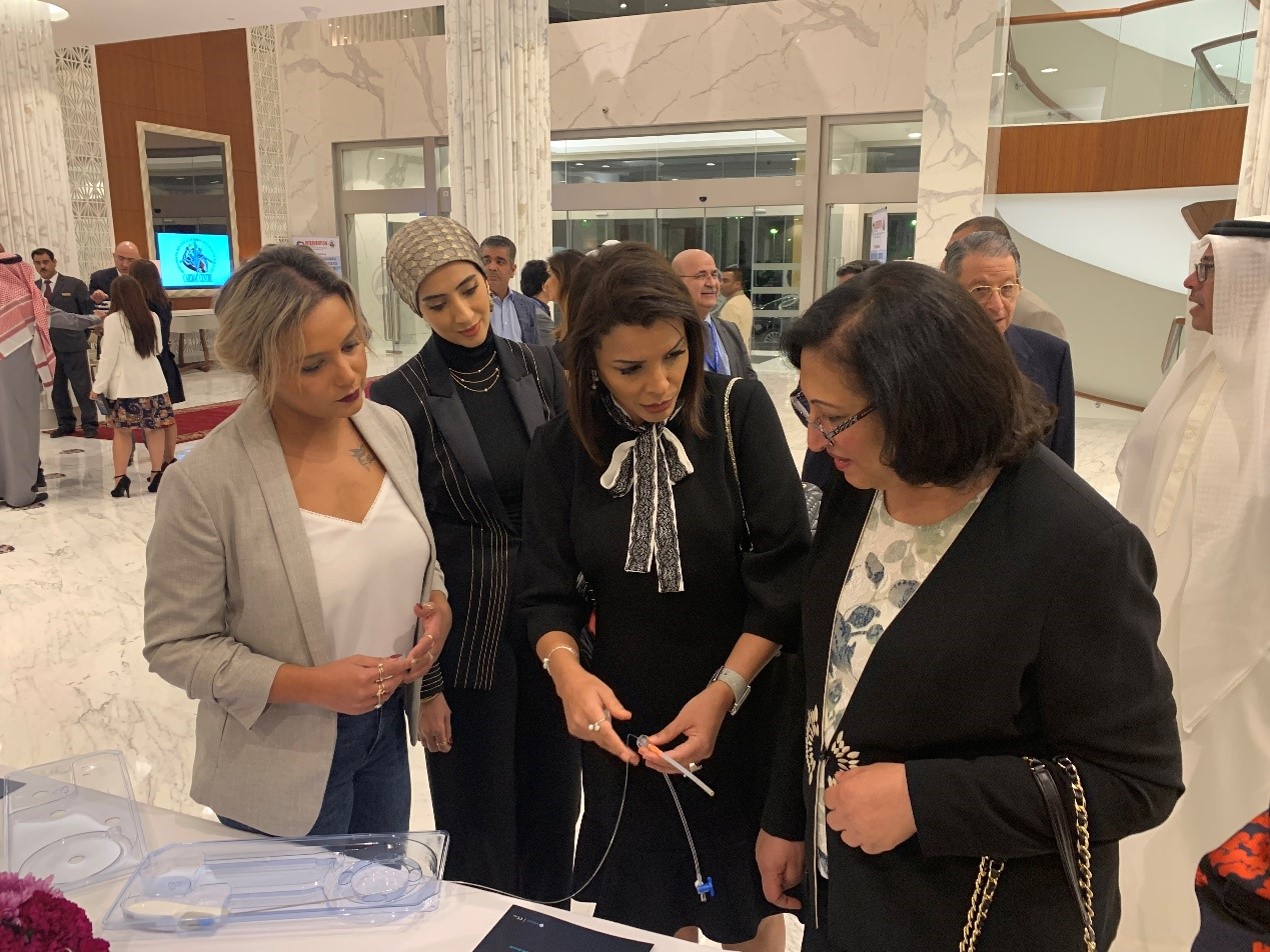 (巴林卫生部长Faeqa Bin Saeed Alsaleh女士(右),巴林心脏病专家Dr. Suad Rashid Al Amer(中)了解先健科技产品)